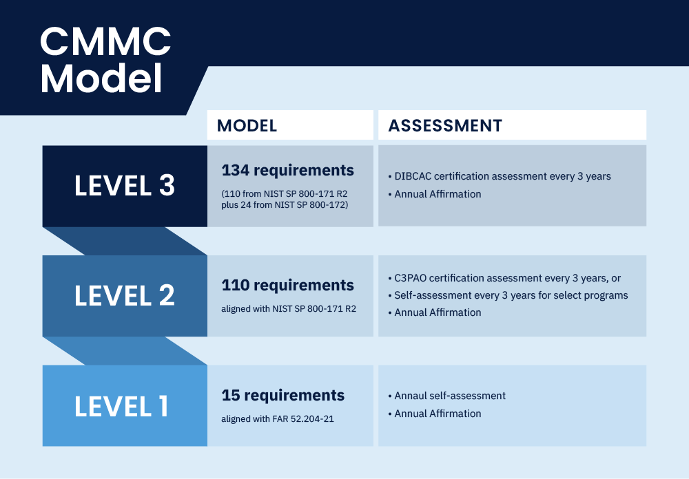 - Level 2: Advanced – Protection of CUI (requires self- or third-party assessments every three years)
